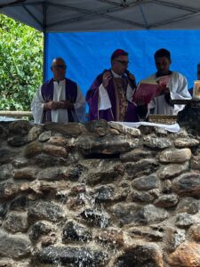 Dentre a programação da Romaria, houve a Celebração Eucarística, presidida pelo nosso bispo Dom Messias. Ao final da celebração foi realizado o plantio de algumas mudas de árvores, bem como o momento de lançamento da Pedra Fundamental, para a construção da da Comunidade Terapêutica Masculina, que vai ser um local de acolhida para homens em situações de dependência química.